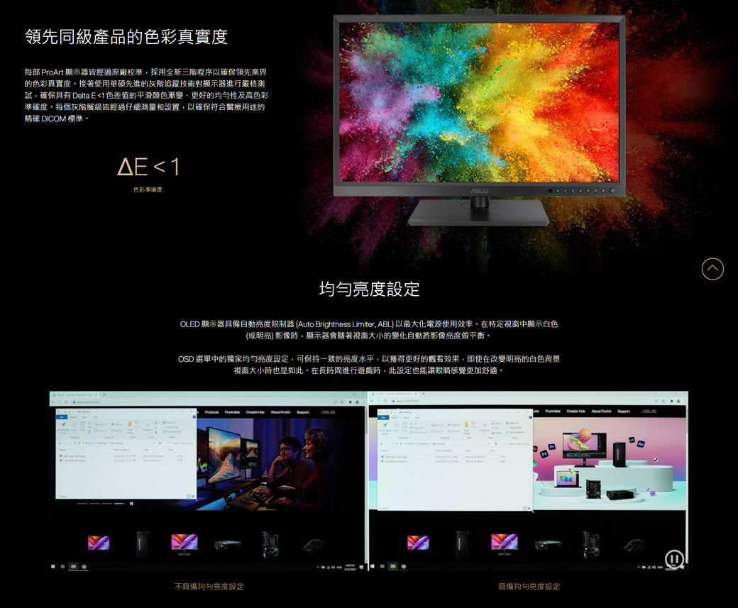 ProArt Display OLED PA32DC 為世界首款具備自動校準功能的 OLED 顯示器。還具備內建的電動翻轉色度計,以確保專業級的色彩準確性。此款 31.5 吋 4K HDR 顯示器使用先進的 OLED 面板,具備純 RGB 燈條和 99% DCI-P3 涵蓋範圍,可提供極為準確的色彩,為您的創作展現最細膩的細節。支援多種 HDR 格式可為創作者提供理想的平台,以製作動態的 HDR 內容。為提供舒適性和便利性,PA32DC 包含兩個支架以適應任何檢視位置或工作環境。