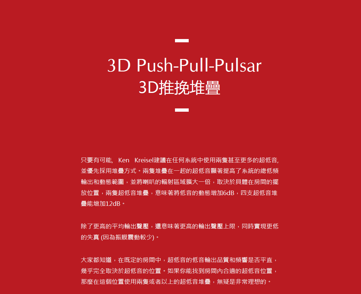 3D Push-Pull-Pulsar專利推挽及超低音堆疊技術|二支12吋低音單體|二台500瓦D類後級|頂級劇院及Hi-Fi專用