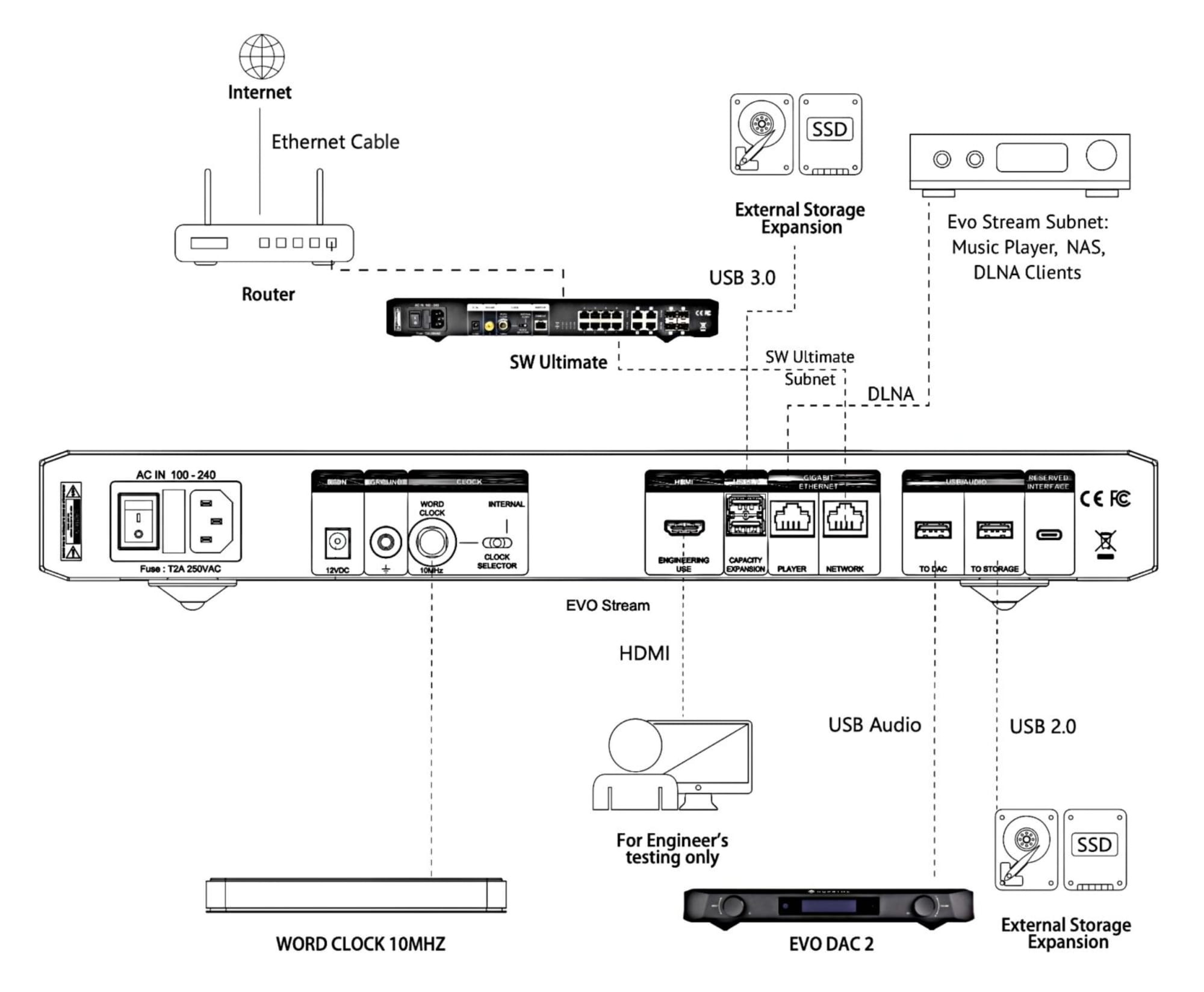 與 Evolution Stream 的子網連接,實現最佳性能,並可連接到 Stream-9 或 DLNA 客戶端等音頻播放器。