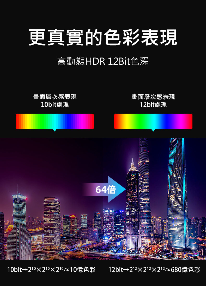 • 支援動態HDR可確保影像的每一幕、甚至每一幀,都顯示出景深、細節、亮度、對比度的理想值以及更寬廣的色域