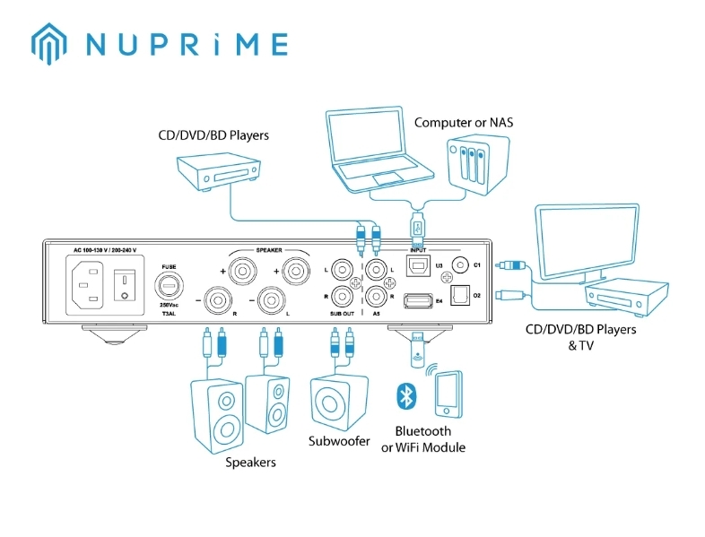 NuPrime 特別設計了一個 USB Type-A 連接埠,用於同時傳輸 S/PDIF 數位音訊訊號與提供 5V 電源。只需一條標準 USB 傳輸線,即可輕鬆連接外部無線音訊接收器。