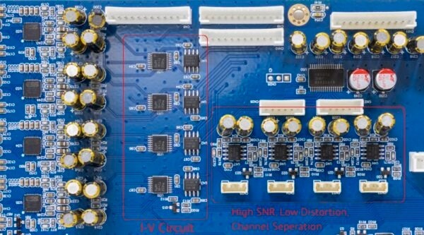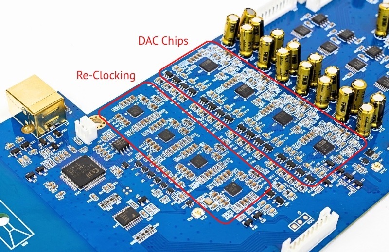 在此架構中,八個數位音訊聲道首先經過重整時鐘(re-clocked),確保精確的時間對齊,然後再分別由四顆高性能 DAC 晶片獨立解碼。透過分配多顆 DAC 負責不同的聲道,此設計能有效降低串擾(crosstalk)與噪音,進而提升聲道分離度、降低失真並擴展動態範圍。