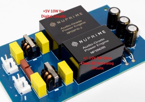 NuPrime 特別設計的 DC 轉換器(DC converters),NP15N08B 與 NP05P10-Z,為類比與數位電路提供獨立且最佳化的電源供應,以確保純淨且精準的音訊表現。NP15N08B 負責提供 +/- 15V 8W 電源給類比電路,而 NP05P10-Z 則提供 +5V 10W 電源給數位電路。藉由將這兩組電源供應隔離,可有效防止數位噪訊與干擾影響類比訊號,確保音訊輸出的純淨度與高保真度。