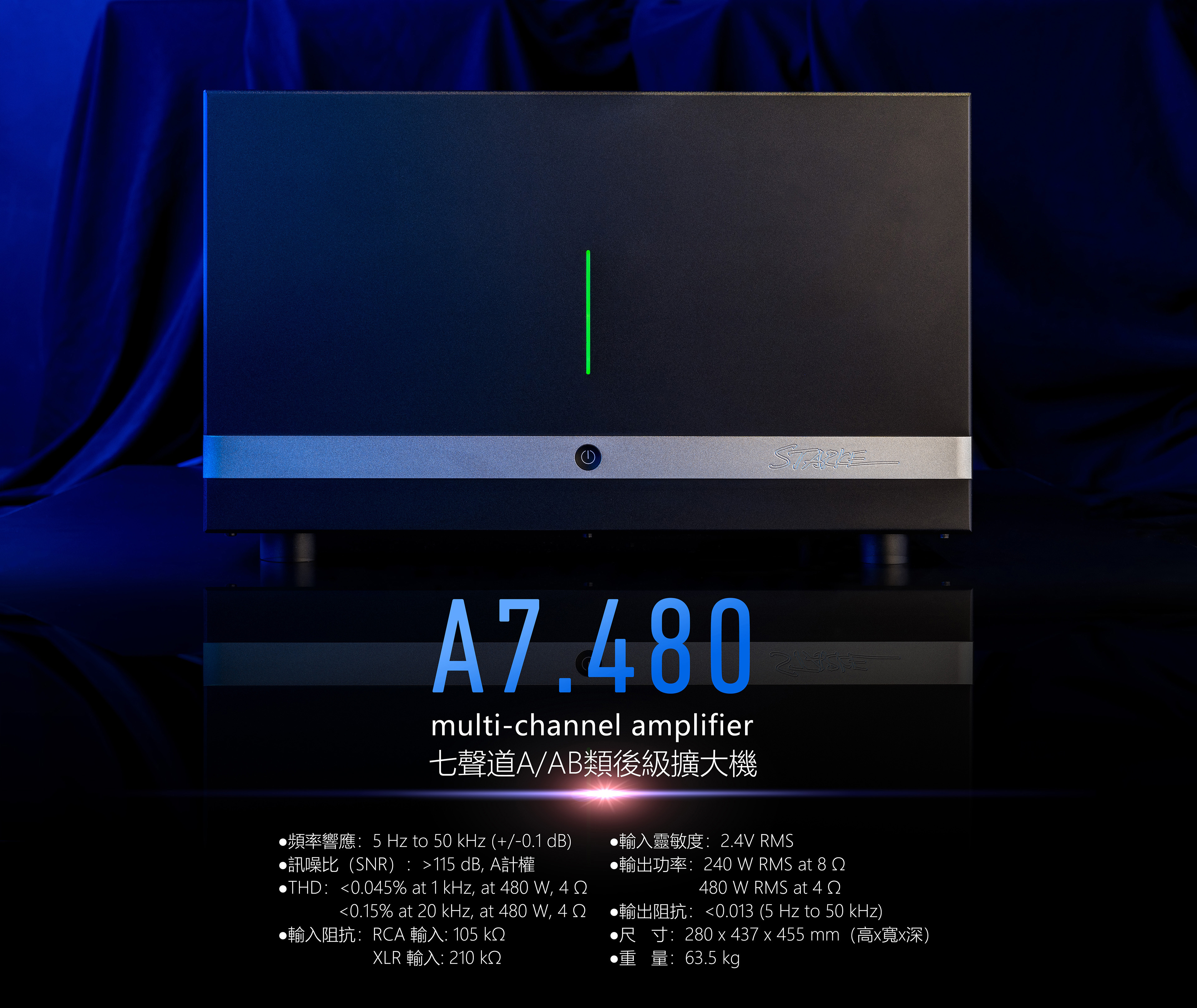 7聲道A類+AB類 全平衡後級|每聲道最高480瓦/4歐姆,240瓦/8歐姆輸出|每聲道最大電流輸出50安培|全模組化設計,每聲道各配一組環形變壓器